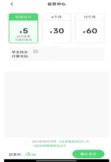 她提供的截图显示,在“会员中心”页面,连续包月的价格是每月5元,“6个月”的价格是30元,“12个月”的价格是60元。另有截图显示,她无法查看孩子的周测考试、期中考试等成绩。