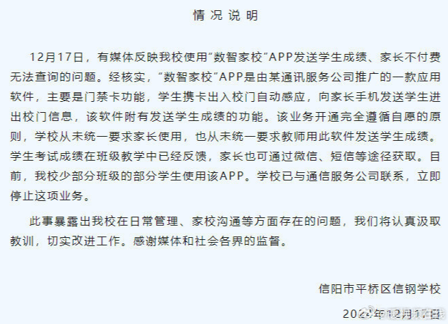据“平桥教育”微信公号12月17日晚消息,河南信阳市平桥区信钢学校发布情况说明,学校从未统一要求家长使用,也从未统一要求教师用此软件发送学生成绩。学生考试成绩在班级教学中已经反馈,家长也可通过微信、短信等途径获取。学校已与通信服务公司联系,立即停止这项业务。