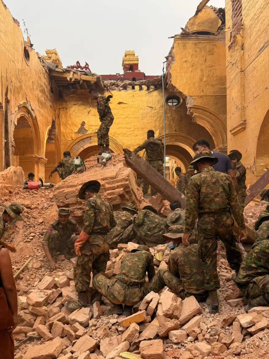 4月5日下午,曼德勒市马哈穆尼寺主建筑一走廊穹顶垮塌,当地军人正在搬运塌毁的碎块。新京报记者 丛之翔 摄