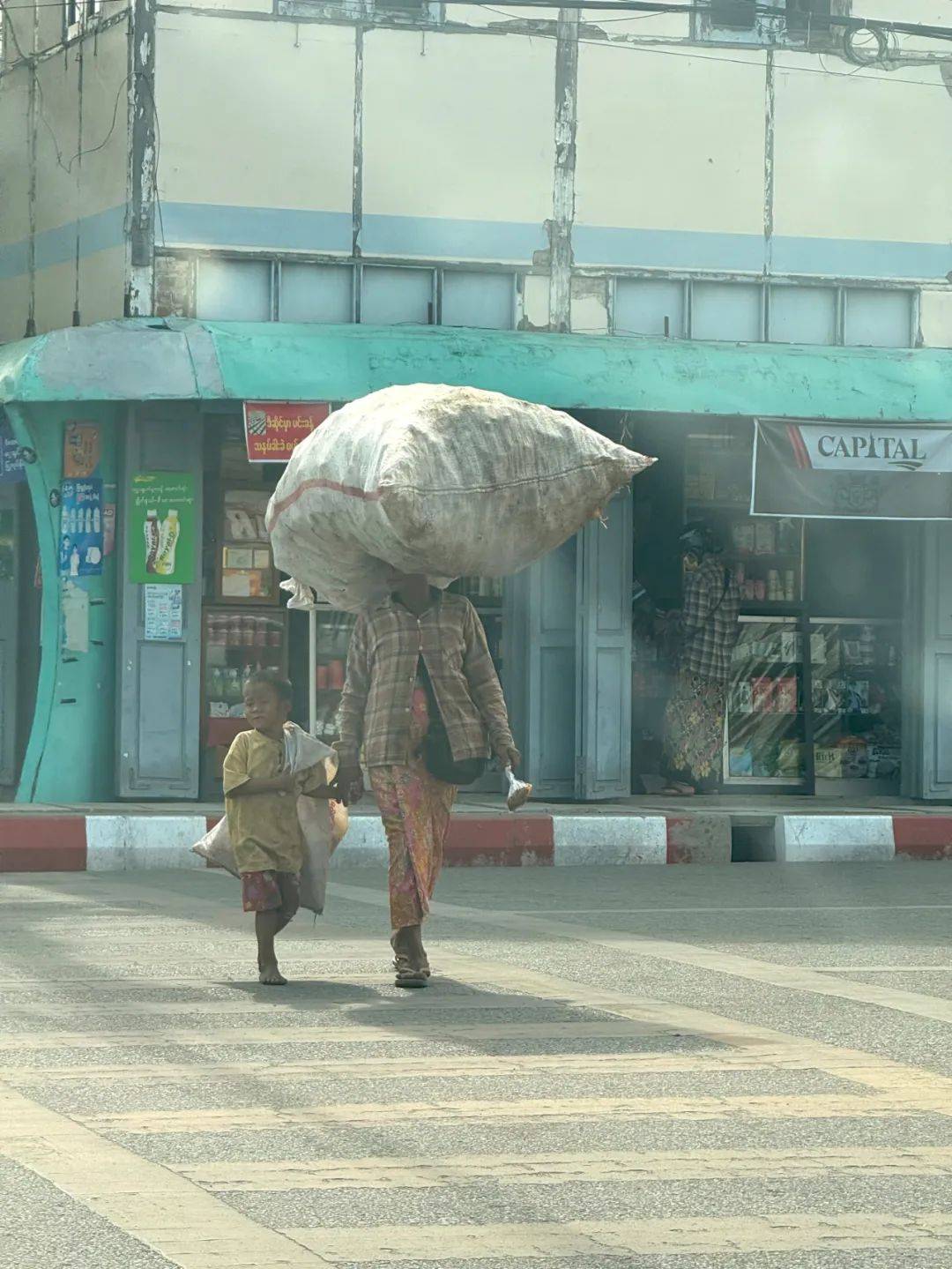 4月11日早上,曼德勒街头,一位女人头顶着体积比自己还大、装满废品的蛇皮袋,牵着孩子去回收。在缅甸,外出做生意的女人会在头上放一块抹布,顶起重物,练习在双手不扶重物的情况下走路。新京报记者 丛之翔 摄