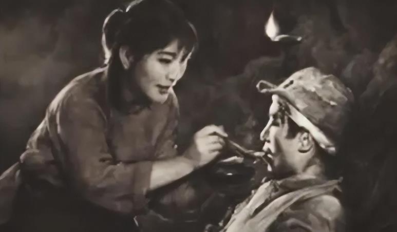 一名八路军战士跪倒在一名少女面前,少女连忙将他扶了起来,看着床上奄奄一息的伤员,点了点头。