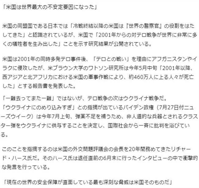 文章援引曾担任美国外交学会会长20年之久的理查德·哈斯在今年6月底卸任前接受采访时的话说,“当前全球安全面临的最严重威胁就是美国本身”。