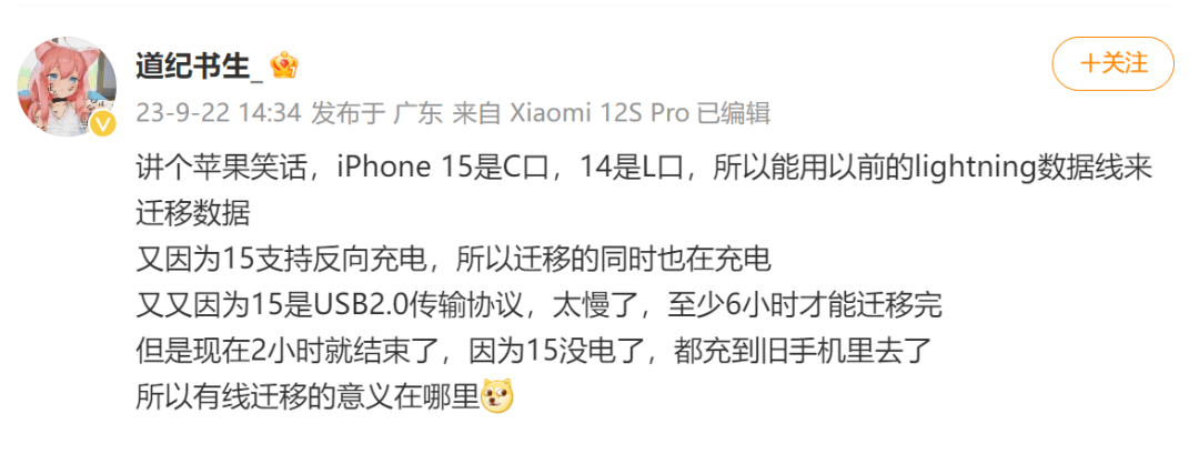 随后就有很多人开始关心起了这个 C 口的兼容性,想知道苹果有没有在一些功能上对 iPhone 15 C 口做出限制,比如不支持一些功能啥的。