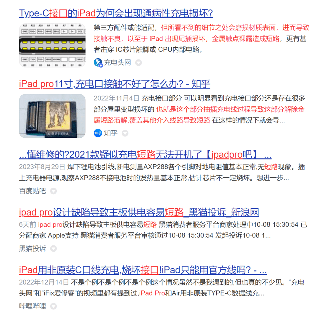 再加上苹果给 iPad Pro 配备的充电线不是完整的单面 12 个、双面 24 个针脚,如果用满针的第三方配件给它充电,确实可能造成接口短路: