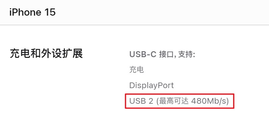 iPhone 15 和 15 Plus 上的 C 口跟上一代 iPhone 一样,还是 USB 2 规格,传输速率最高只能到 480Mb/s,有线充电速度则在 20W 出头: