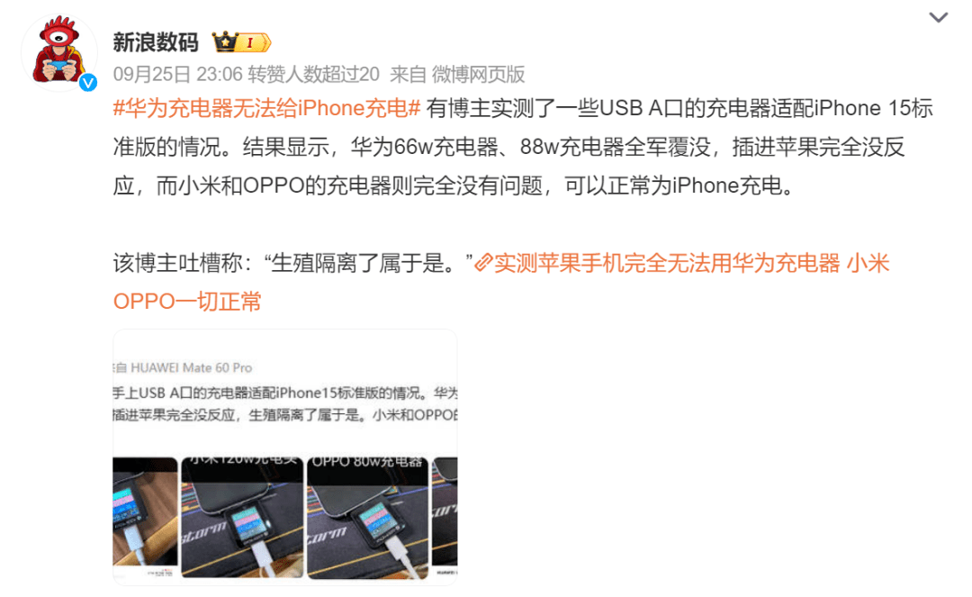 等到该测的测完、该骂的骂完后,正当我以为事情就要告一段落时,又有博主发现华为充电器无法给 iPhone 15 充电,一下子又把话题推上了热搜。
