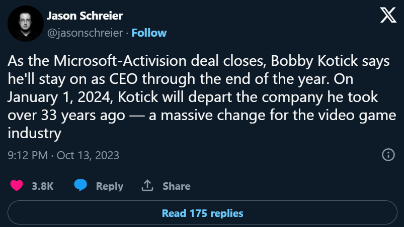 再加上暴雪 CEO 鲍比・考迪克宣布 2024 年将离开暴雪。
