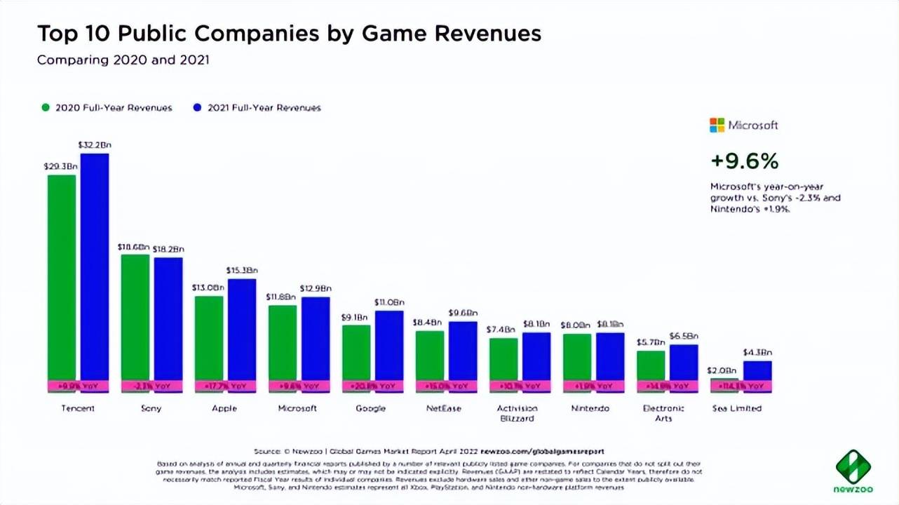 根据 2021 年 Newzoo(国外调研公司)透露的全球十大游戏公司收入榜,