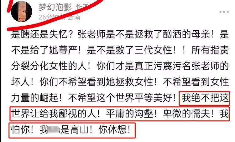 这些批评最先遭到编剧之一袁媛的强烈斥责,她说:“是瞎还是失忆?张老师是不是拯救了酗酒的母亲?”“你们才是真正污蔑污名张老师的坏人!”袁媛还用“平庸的沟渠”“卑微的懦夫”来形容批评者,甚至不顾体面地讲出“我才是高山”。